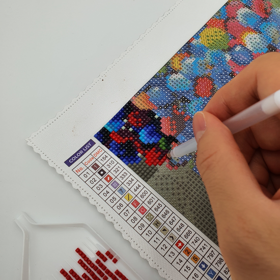 Using the waxed up pen, pick up each drill one by one and apply it to the matching symbol on the canvas, directly on the adhesive. Keep working through until the complete picture is filled in. Patience is key - it's worth it!