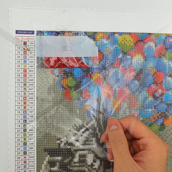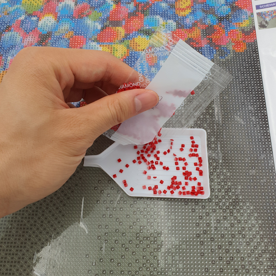 Pick a colour you want to start working on. Find the matching colour diamond drills in your batch. Cut open the packet and pour out the drills on the tray.